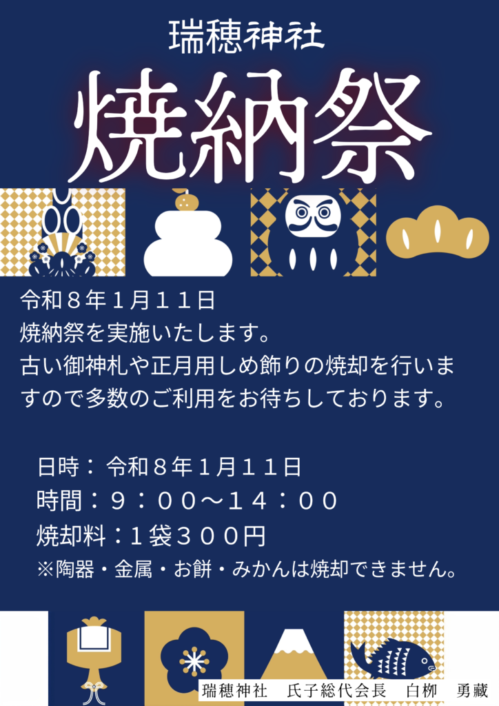 1月11日(日)瑞穂神社 焼納祭のご案内 お知らせ 2026.01.05 お知らせ 焼納祭(しょうのうさい) まず、境内や空き地などに祭場を定め、その四方を忌竹で囲み、注連縄を張る。奥に火処を設置し、神札やお守りなどを積み上げ、その手前に案を設置する。 手水をおこない、修祓、献饌、祝詞奏上、玉串拝礼、昇神、撤饌後に、神職が浄火にて神札などを奉焼する。 御焚上祭、奉焼式、左義長焼き、古札焚上式、どんど焼きなどと呼ぶ場合もある。また、古い縁起物や人形などを御焚上する場合もある