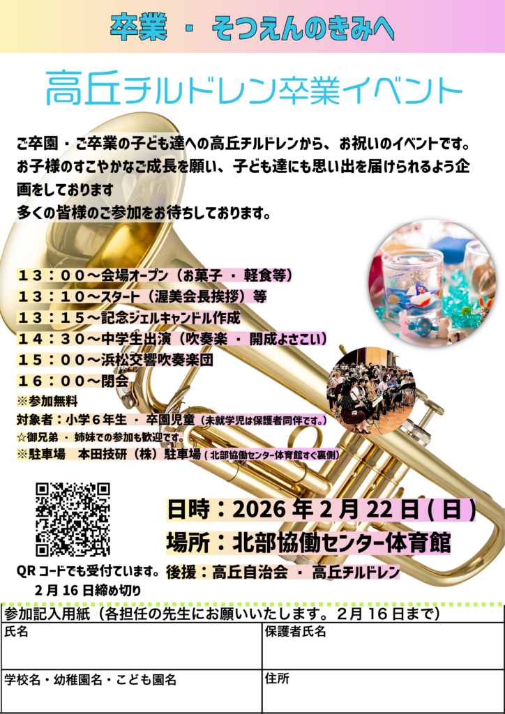 3月にみおつくし文化センターで行われる静岡県子ども連合会のイベントに高丘が代表でお囃子・ラッパを披露します。